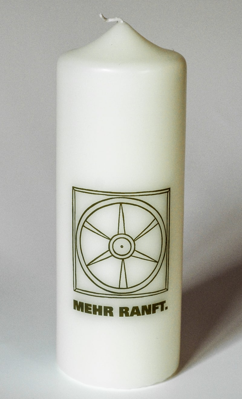weisse Kerze mit rot-goldenem Radbild und goldener Aufschrift