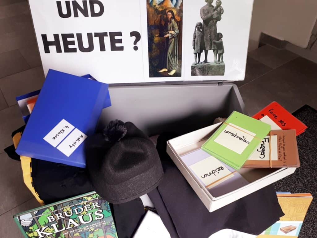 Textes et vêtements pour un jeu de rôles, DVD «Jugend erklärt Niklaus von Flüe» (en allemand), des cartes d’activité, BD «Frère Nicolas – la merveilleuse histoire de Saint Nicolas de Flüe», matériel de quiz et le plan de leçon.