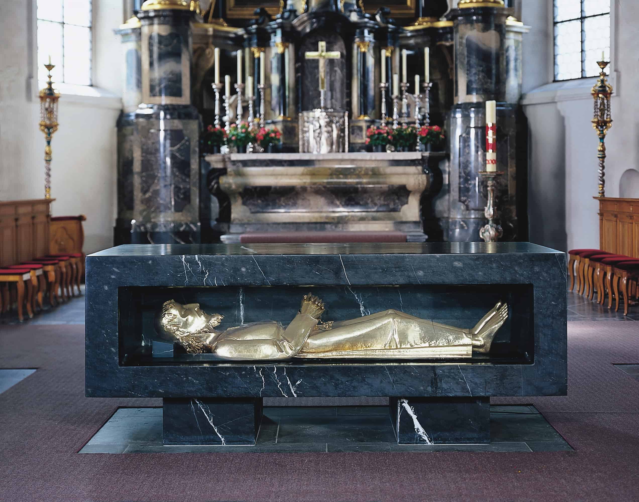 Le sue reli­quie sono state collo­cate nella figura d’ar­gento di Mein­rad Burch dal 1934. Sono stati inte­grati nel­l’al­tare a bloc­chi creato da Alois Spich­tig nel 1976.