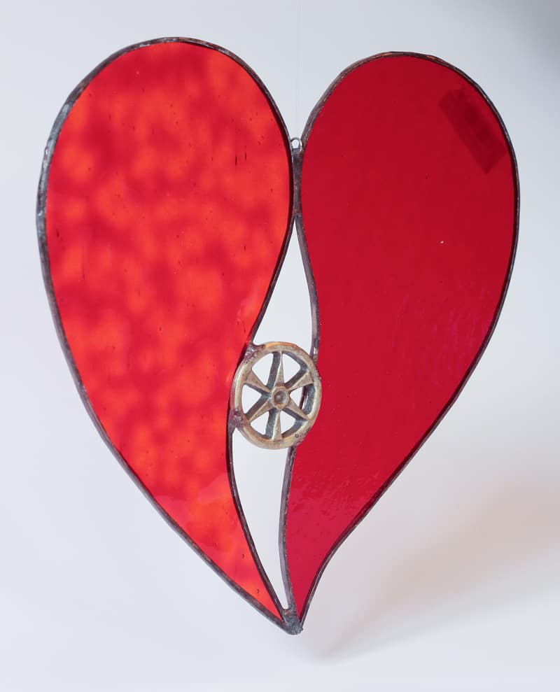 Herz aus rotem Glas mit einem Rad aus Bronze, Hand­ar­beit
