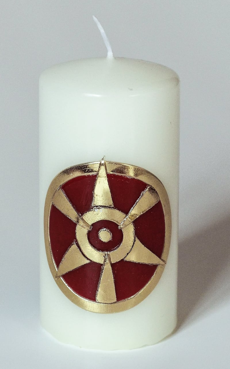 weisse Kerze mit rot-goldenem Radbild und goldener Aufschrift