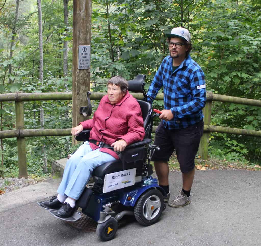 Beglei­te­tes, elek­tri­sches Mobil für Men­schen, die nicht mit eige­ner Kraft in den Ranft hin­un­ter gehen und wie­der hin­auf stei­gen kön­nen.